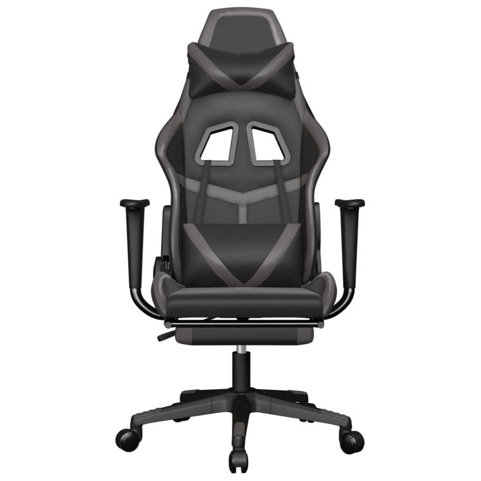 เก้าอี้เกมมิ่งหนังเทียมสีดำและสีเทา พร้อมโครงโลหะ ไม้อัด และพลาสติก ทนทานและมีสไตล์สำหรับนักเล่นเกมมืออาชีพ