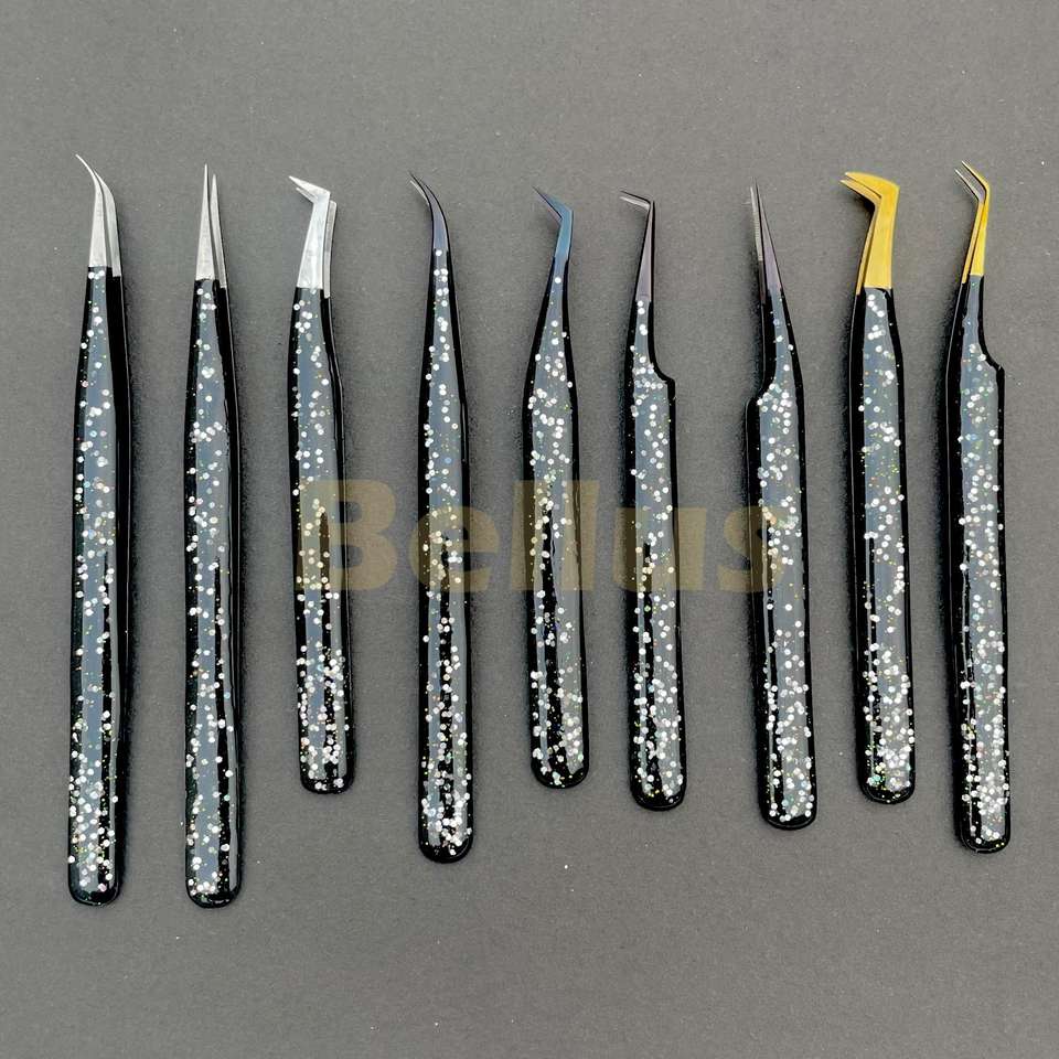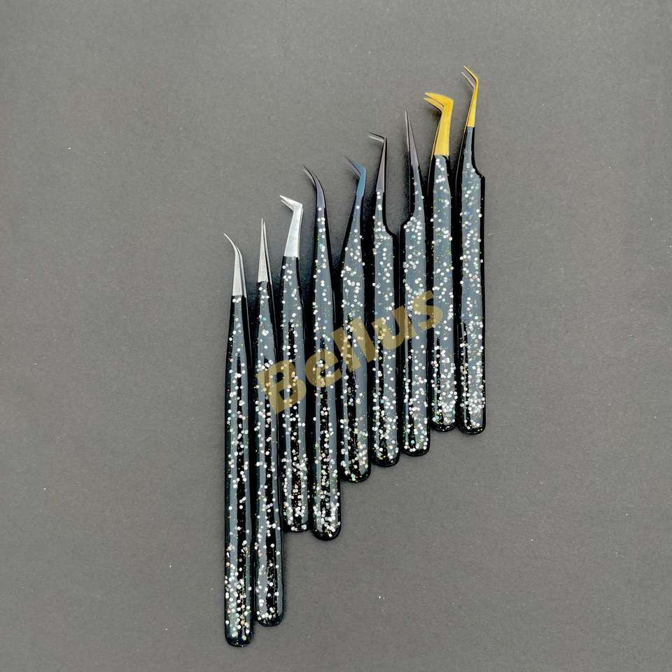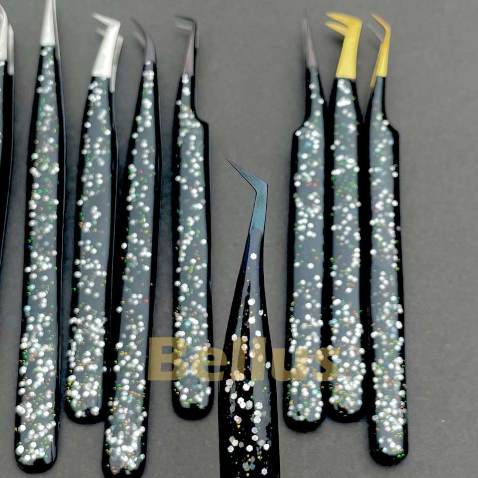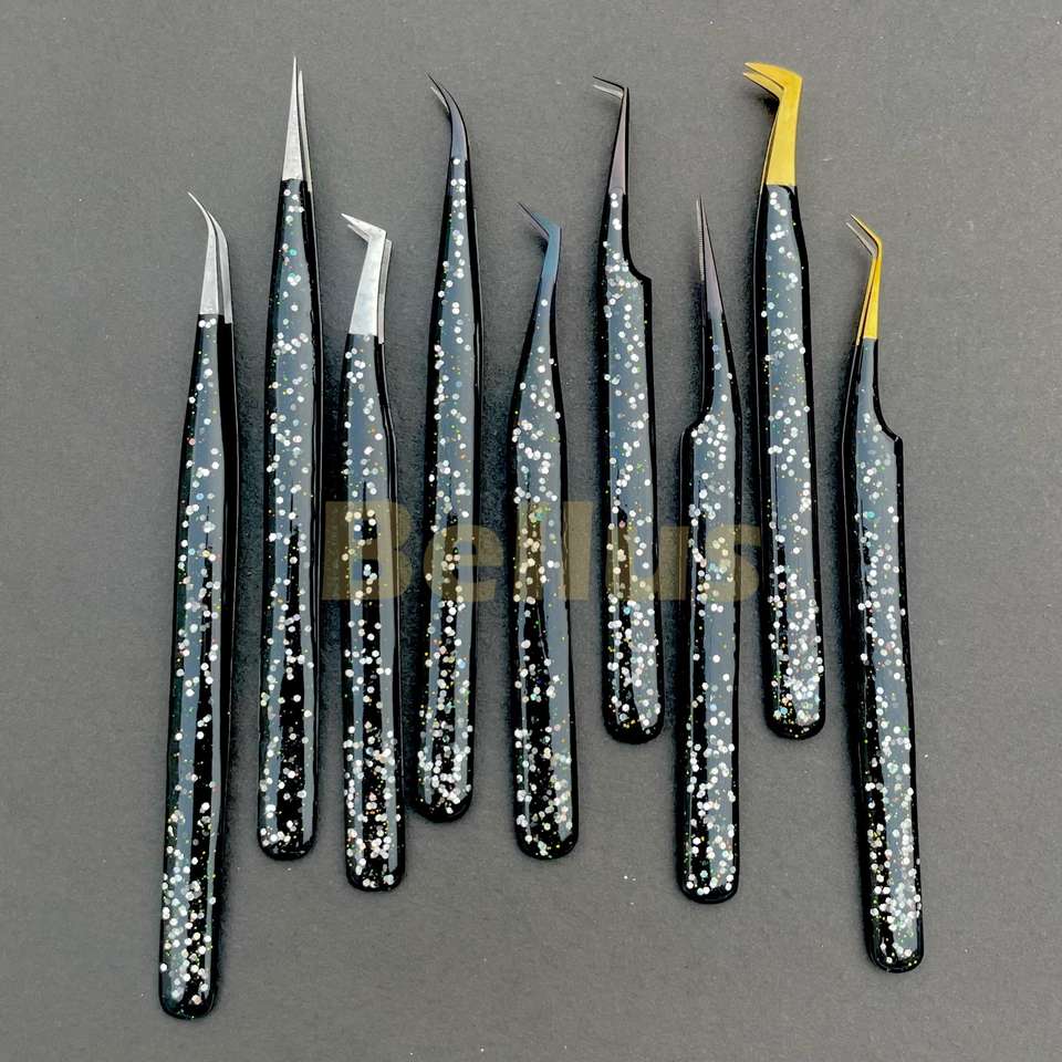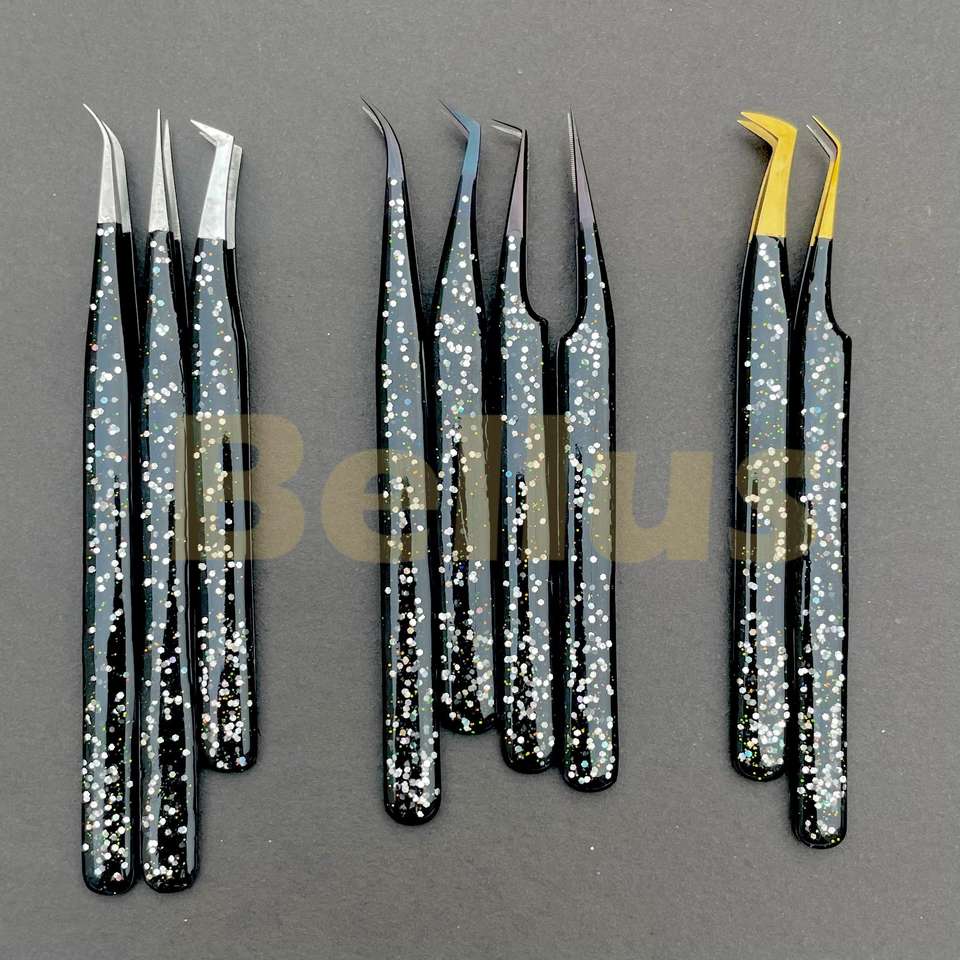 แหนบปลายขนตาสีดำและสีเงินสีทองพร้อมปลายไฟเบอร์คีมหนีบขนตาโลโก้ส่วนตัวแบบกำหนดเองสำหรับการต่อขนตา