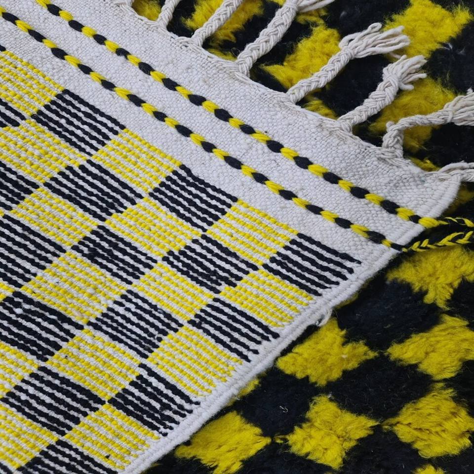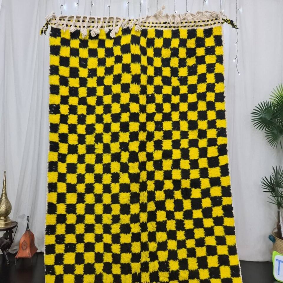 พรมลายตารางหมากรุกสีดำและเหลืองดีไซน์เนอร์พรมทอมือพิมพ์ลายแบบผ้าคอตตอน100% สำหรับห้องนั่งเล่นที่บ้าน