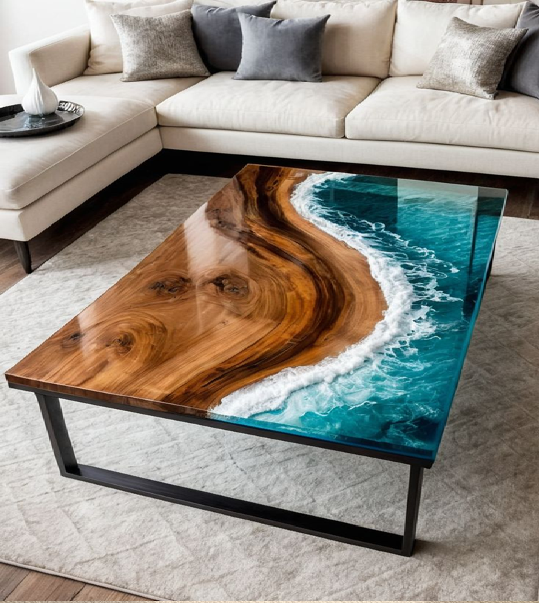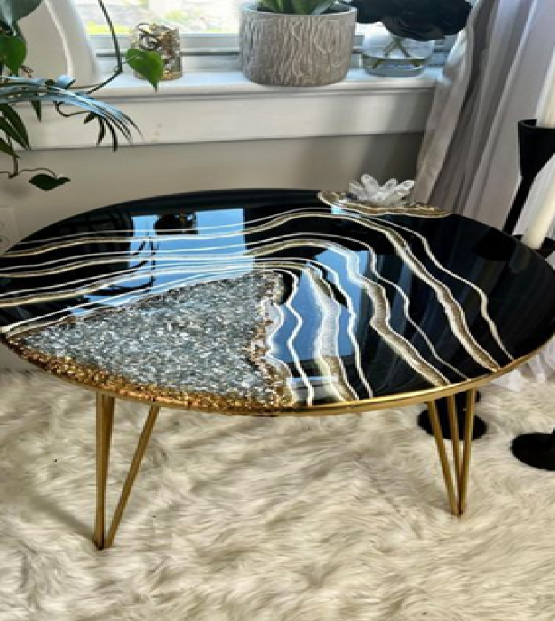 Black and gold geode resin table. Round accent table with crushed glass. Available at wholesale prices