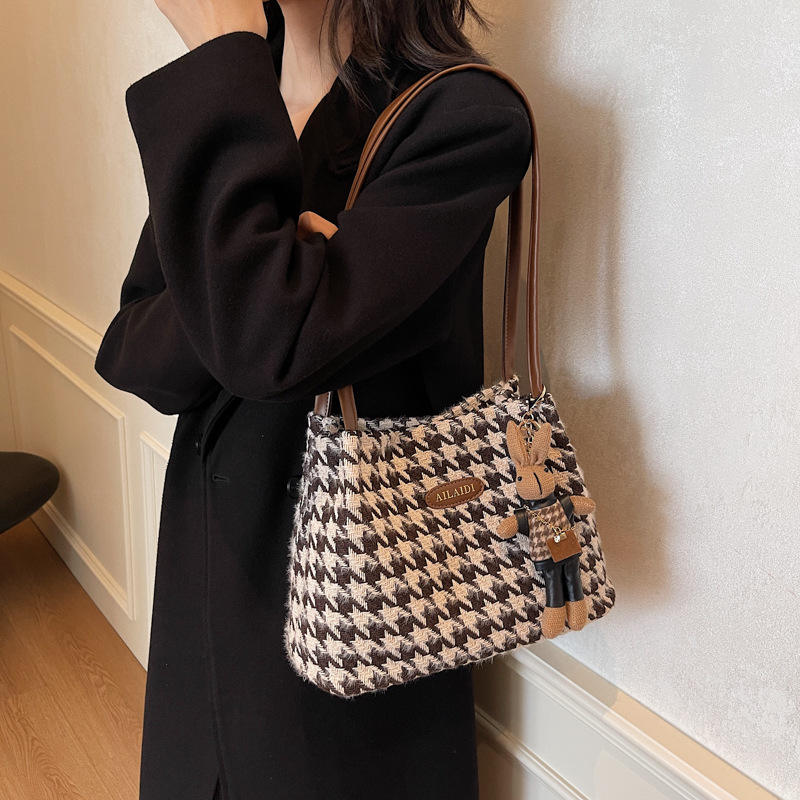 กระเป๋าสะพายไหล่ลายสก๊อตสีดำและสีขาวดีไซน์คลาสสิกกระเป๋าถือแฟชั่นของผู้หญิง