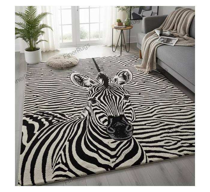 พรมลายม้าลายขาวดำ ดีไซน์ภาพม้าลายอย่างละเอียด ตกแต่งห้องนั่งเล่นสไตล์โมเดิร์น ใช้เป็นพรมปูพื้น