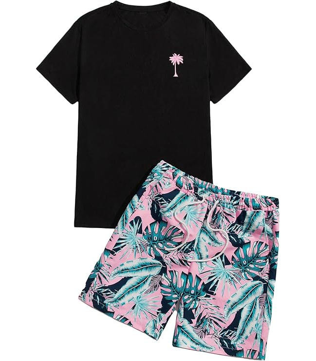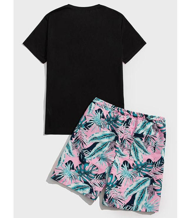 ชุดวอร์มผู้ชายมีฮู้ดสีดำพร้อมลายต้นปาล์มสีชมพูเล็กๆ และกางเกงขาสั้นพิมพ์ลายใบไม้เขตร้อน-ลำลองสำหรับฤดูหนาว