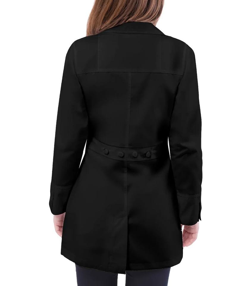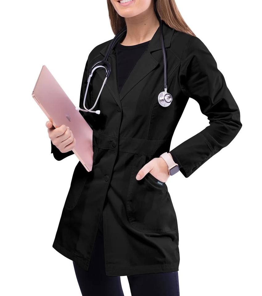 เสื้อกาวน์สีดำสำหรับพนักงานหญิง แขนยาว ชุดยูนิฟอร์มทางการแพทย์แบบมืออาชีพ เหมาะสำหรับโรงพยาบาล ห้องปฏิบัติการ พยาบาล และร้านขายยา