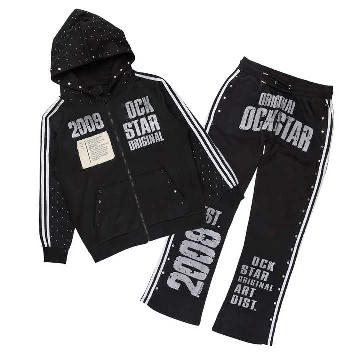ชุดวอร์มสีดำพิมพ์ลายมีฮู้ดและวิ่งพร้อมแถบข้างสไตล์สตรีทสวมใส่สบายชุดออกกำลังกายในยิมชุดกีฬา