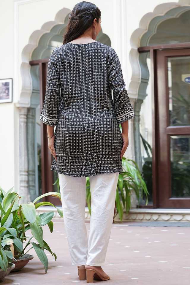 ชุดคุर्ติสั้นสีดำลายดอกไม้เล็กๆ ทำจากโพลีเอสเตอร์สำหรับผู้หญิง คอรูเล็ก แขน 3/4 ทรงยาวระดับกลางต้นขา