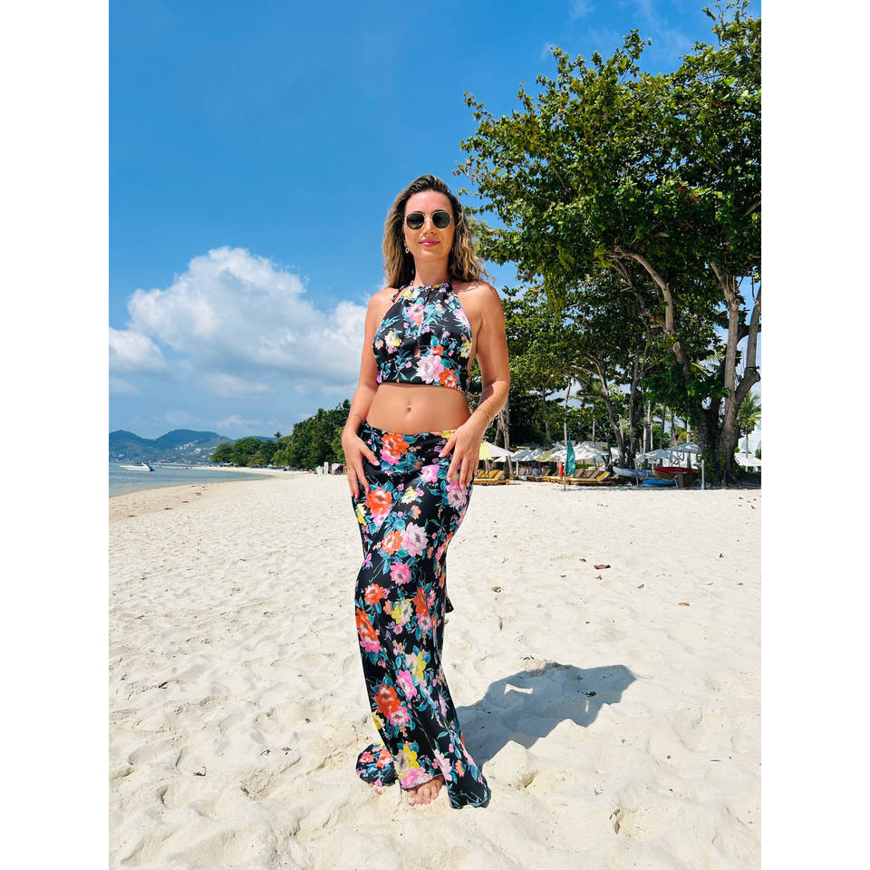 เสื้อลายดอกไม้ผ้าซาตินสีดำเปลือยหลังทำด้วยมือ