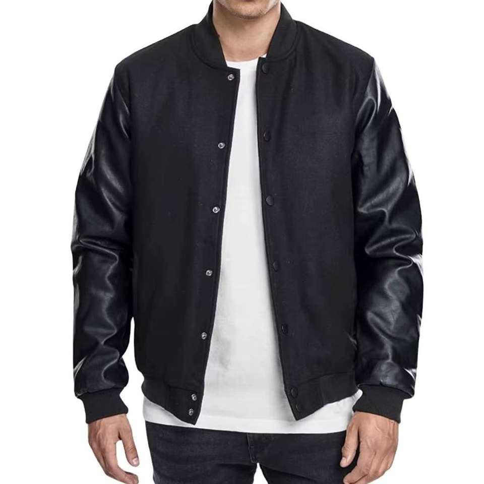 เสื้อแจ็คเก็ตวาร์ซิตี้แบบถักกันน้ำมีฮู้ดสีดำสำหรับผู้ชายและผู้หญิง สไตล์เบสบอล ดีไซน์สีดำล้วน แขนเสื้อแบบริบ ตัวเลือกแบบให้ความอบอุ่น