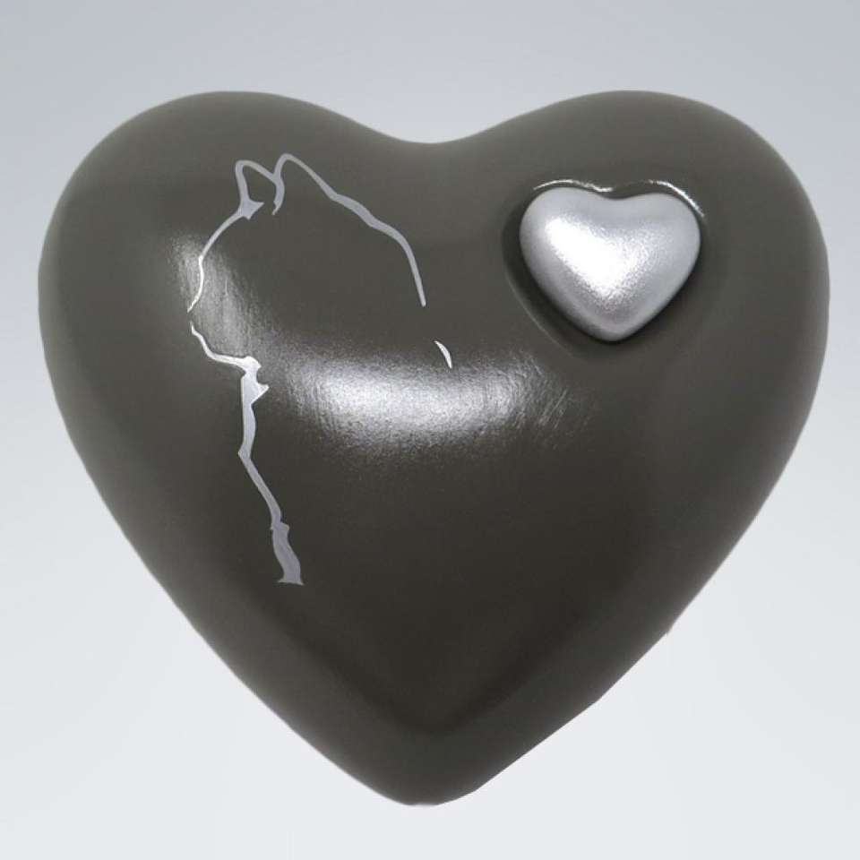 โถใส่เถ้ากระดูกรูปหัวใจขนาดเล็ก สีดำพิมพ์ลายสุนัขสีเทา สำหรับใส่เถ้ากระดูกในพิธีศพ ทำจากโลหะทองเหลือง/อะลูมิเนียม