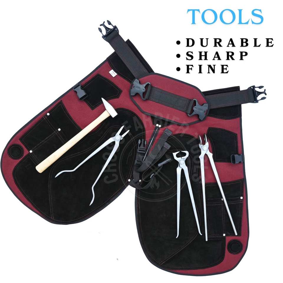 ชุดเครื่องมือช่างตีเหล็กพร้อมผ้ากันเปื้อน คีมตัดตะปูหัวกลม ค้อนตอกตะปู คีมดึงตะปู คีมจีบตะปู และเครื่องมือดึงตะปูรองเท้า