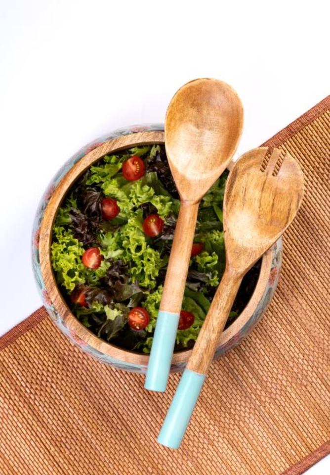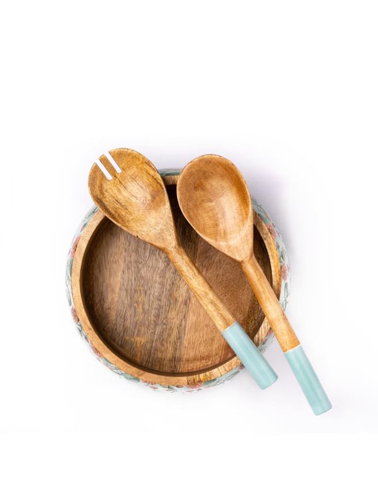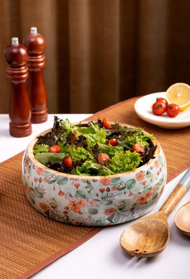 ชุดชามและช้อนไม้พิมพ์ลายเคลือบสวยงามใช้สำหรับขัด