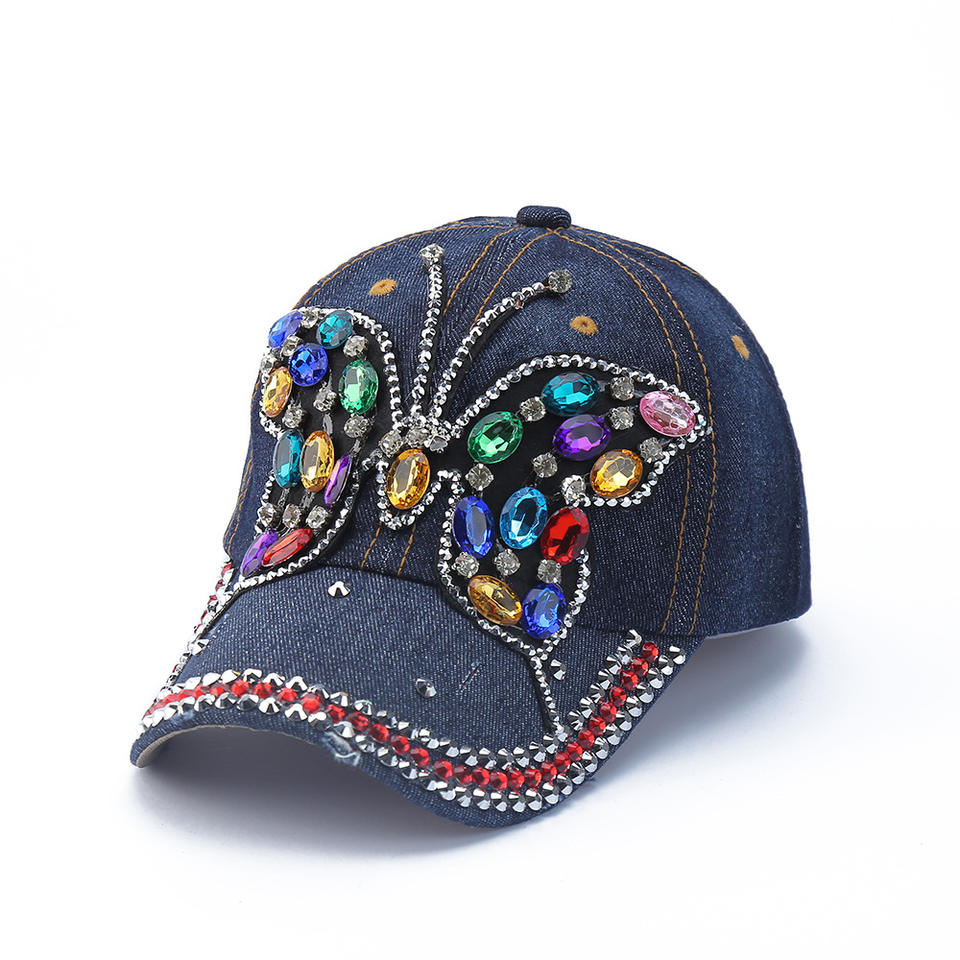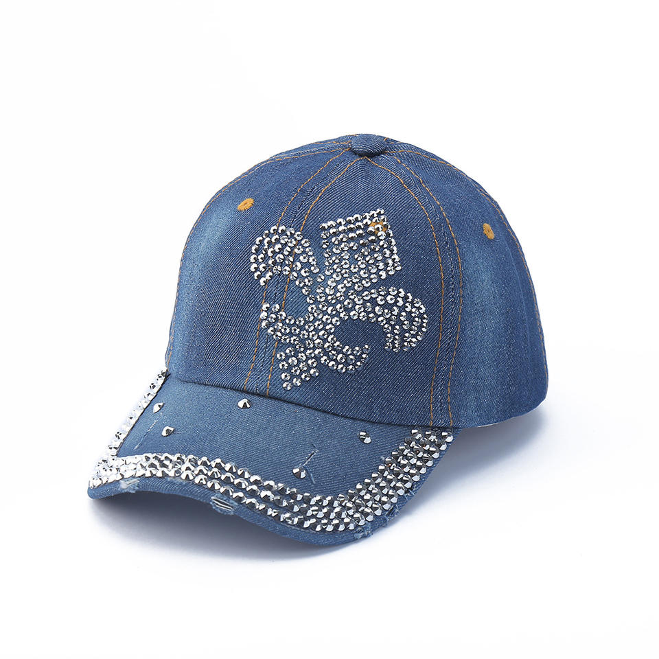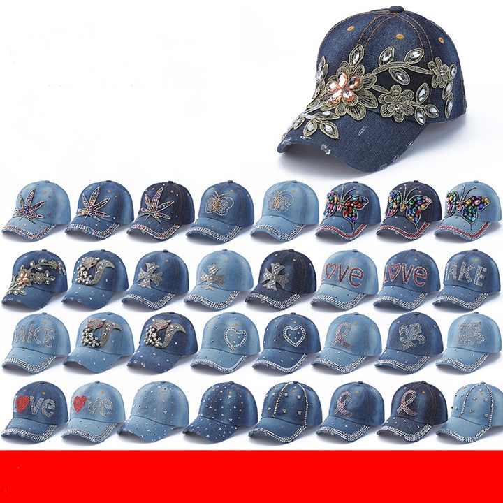 หมวกเบสบอลประดับเพชรสำหรับผู้หญิง หมวกกันแดดผ้าเดนิมตกแต่งคริสตัล หมวกกอล์ฟผ้าเดนิมประดับหมุดและคริสตัล ปรับขนาดได้ ปีกโค้ง หมวก 6 แผง