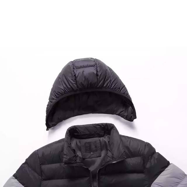 แจ็กเก็ตขนเป็ดสไตล์ไฮสตรีทสำหรับผู้ชายผ้าแคนวาสไนล่อนสีบล็อกโพลีเอสเตอร์100% กันน้ำดีไซน์แบบมีฟองแฟชั่นใหม่