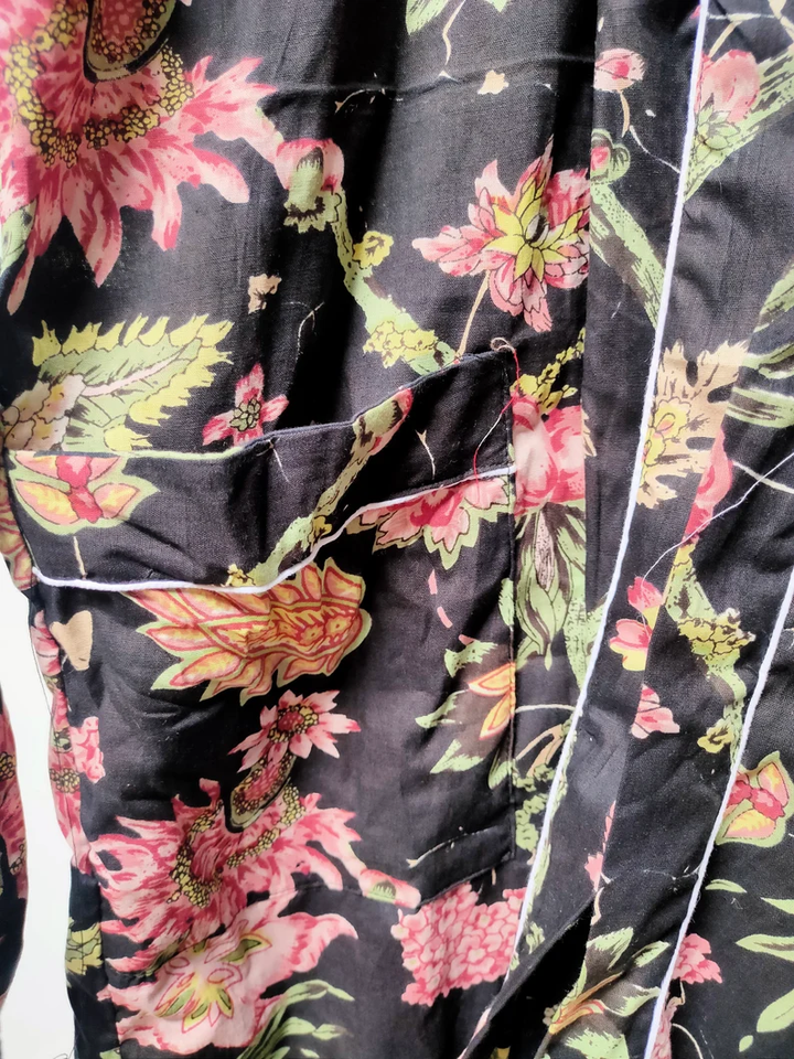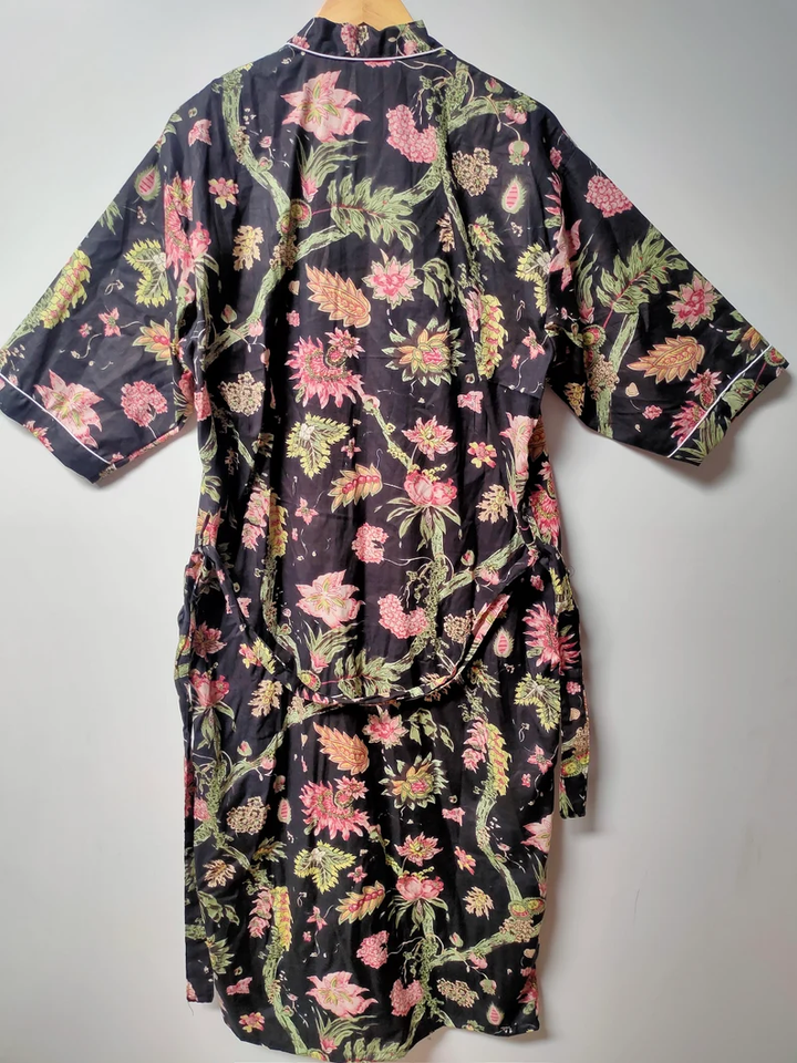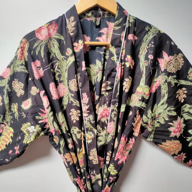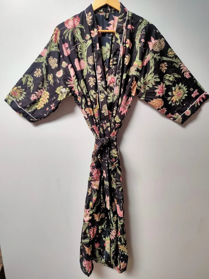 ชุดกิโมโนลายพิมพ์บล็อกการ์ตูนสำหรับผู้หญิง ผ้าฝ้าย 100% ชุดนอนฤดูร้อน ทำมือ ODM คอวี เอวยางยืด ยาวถึงเข่า เนื้อผ้านุ่ม ระบายอากาศได้ดี