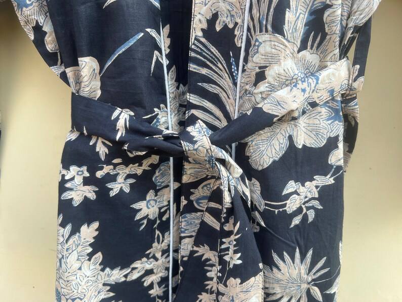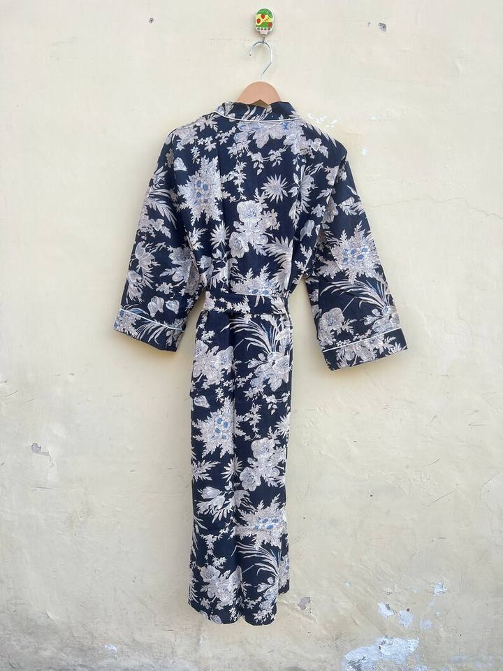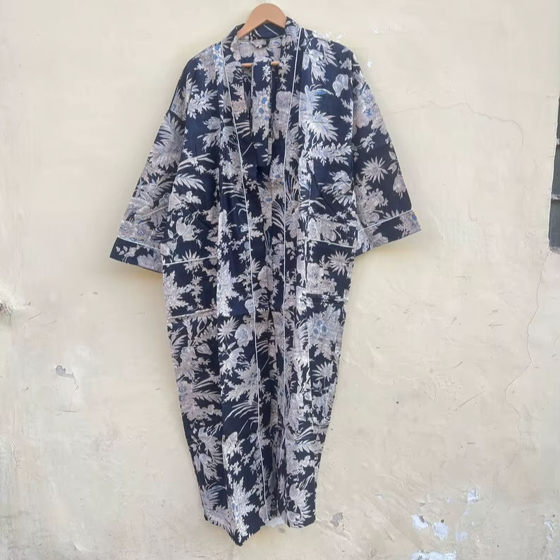 ชุดกิโมโนลายพิมพ์บล็อกการ์ตูนสำหรับผู้หญิง ผ้าฝ้ายทอ 100% ชุดนอนฤดูร้อน ทำมือ ODM คอวี เอวยางยืด ความยาวระดับเข่า/เต็มตัว เนื้อผ้านุ่ม