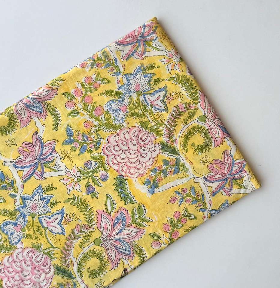 ผ้าคอตตอนแคมบริกพิมพ์ลายบล็อก 60x60 ซม. ลายดอกไม้แบบดั้งเดิมจากเมืองชัยปุระ ผลิตด้วยบล็อกไม้ เป็นมิตรต่อสิ่งแวดล้อม เหมาะสำหรับตกแต่งบ้าน ทำกระเป๋า และปลอกหุ้ม