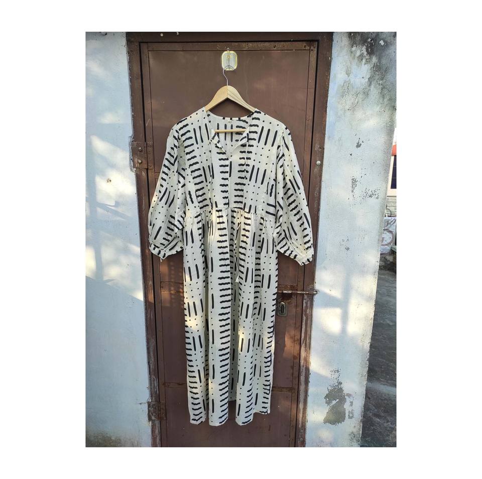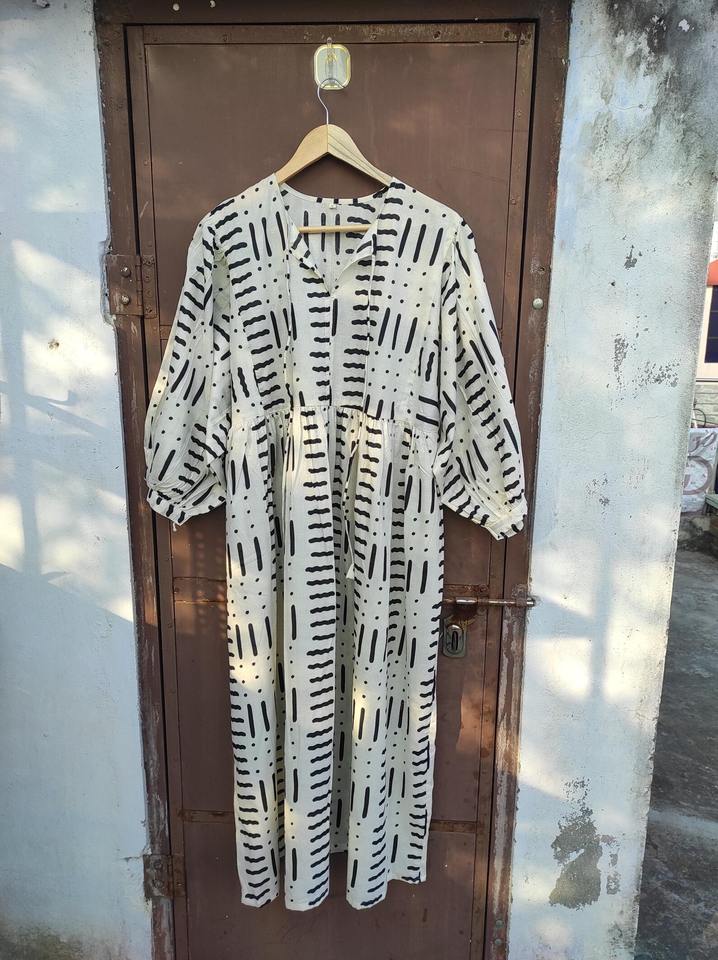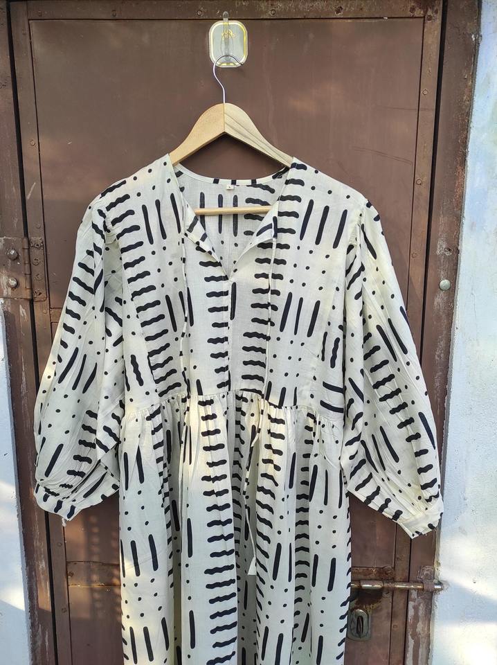 เดรสผ้าฝ้ายพิมพ์ลายบล็อก - ผ้าฝ้ายเนื้อนุ่ม, คอลเลคชั่นคริสต์มาส 2025, เดรสฮิปปี้สีขาวดำ