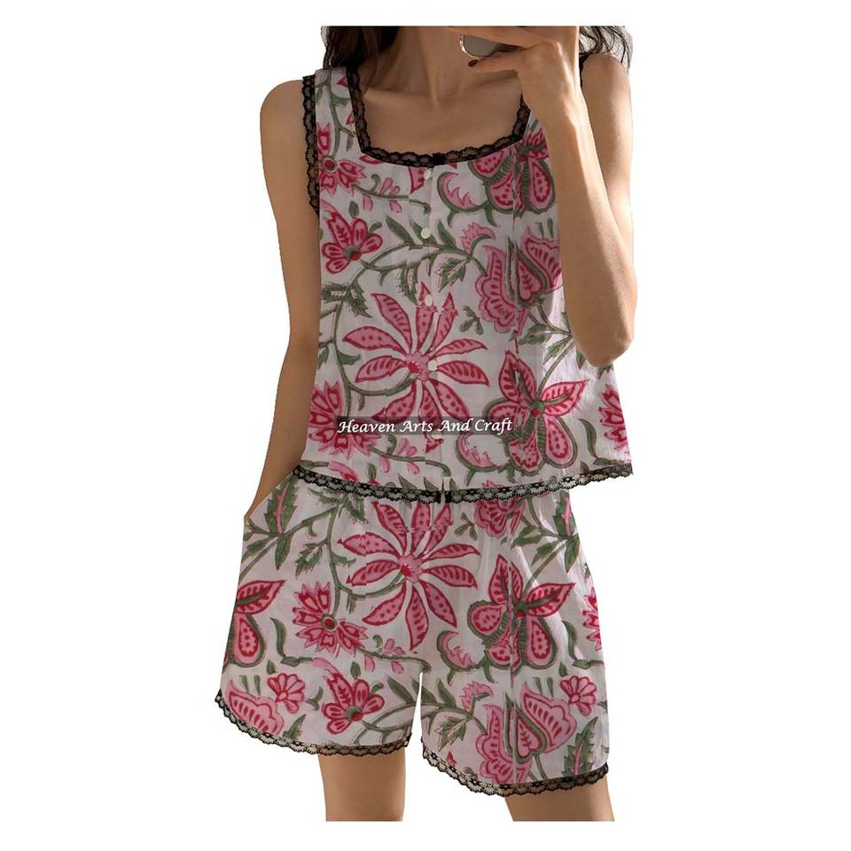 ชุดนอนขาสั้นผ้าฝ้ายพิมพ์ลายบล็อกพร้อมลูกไม้ ชุดนอนผู้หญิงสำหรับฤดูใบไม้ผลิ/ฤดูร้อน ลายดอกไม้ ชุดนอนแขนกุด พิมพ์ลายบล็อก ขายส่ง