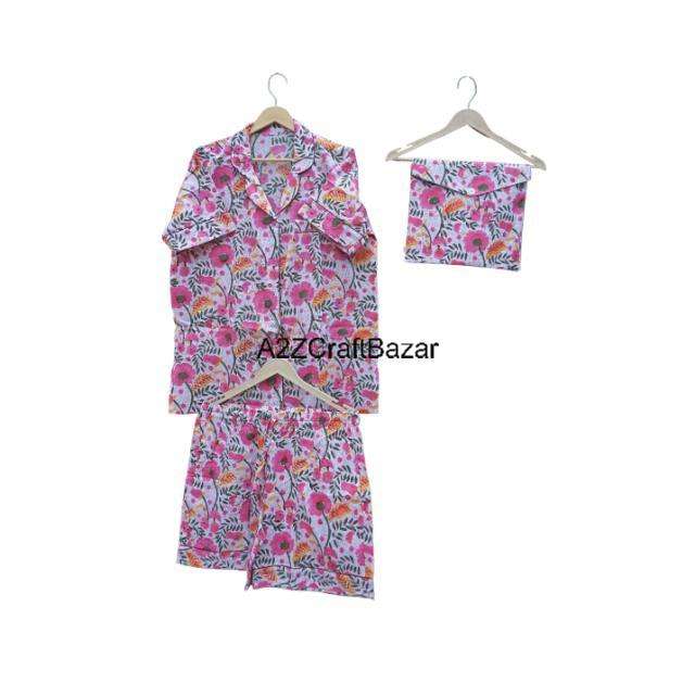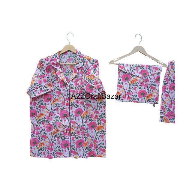 ชุดนอนสตรีลายดอกพิมพ์บล็อก ผ้าฝ้ายแท้ 100% เนื้อนุ่ม ผูกเชือก ชุดนอนฤดูร้อน