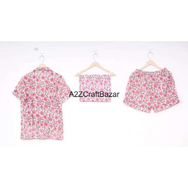 ชุดนอนผู้หญิงลายดอกพิมพ์บล็อก ผ้าฝ้ายแท้ 100% นุ่ม ระบายอากาศ แห้งเร็ว มีเชือกผูก