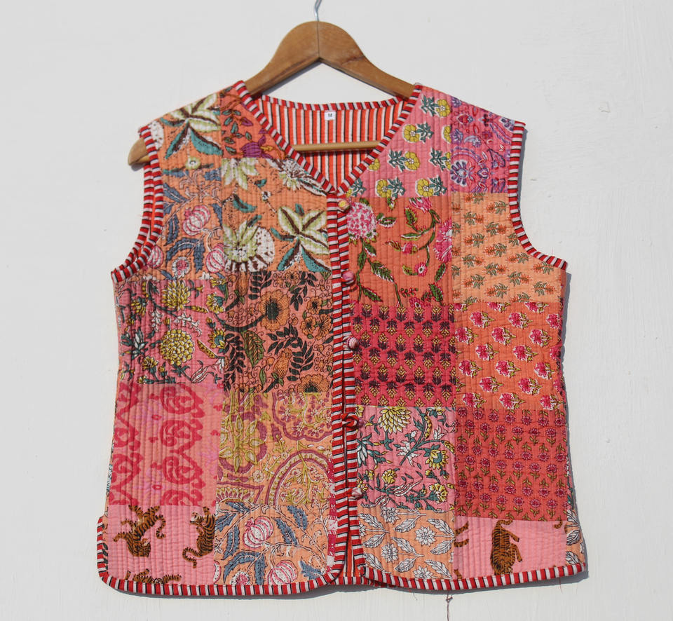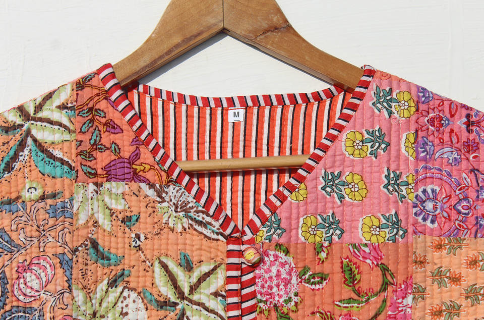 เสื้อแจ็คเก็ตพิมพ์ลายบล็อก ผ้าฝ้ายอินเดีย เสื้อกั๊กบุผ้านวมสำหรับผู้ชาย งานแฮนด์เมดสไตล์วินเทจ เย็บอย่างประณีต เสื้อแจ็คเก็ตคันธาพิมพ์ลายบุผ้านวม