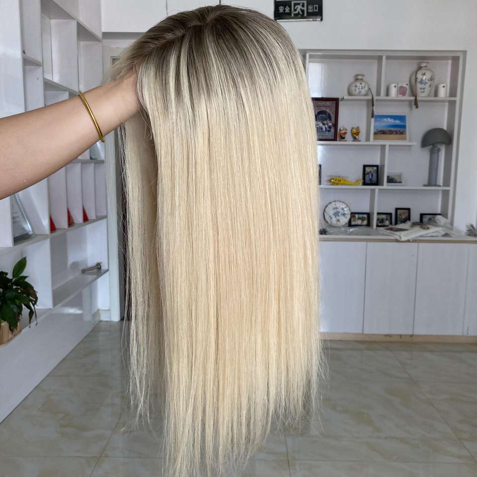 วิกผมสีบลอนด์ ผมแท้ยุโรป แบบเวอร์จิ้น ไฮไลท์สีขาว สำหรับผู้หญิง ผมสองชั้น จัดเรียงเกล็ดผม แบบดิบ HD Lace สำหรับติดกับผม # เอสบีที18-60