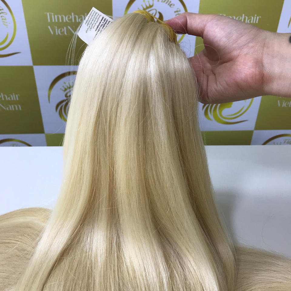 ผมต่อสีบลอนด์เวียดนามแบบพรีเมี่ยมสีบลอนด์มีล็อกสีเดียวพร้อมเงาธรรมชาติ
