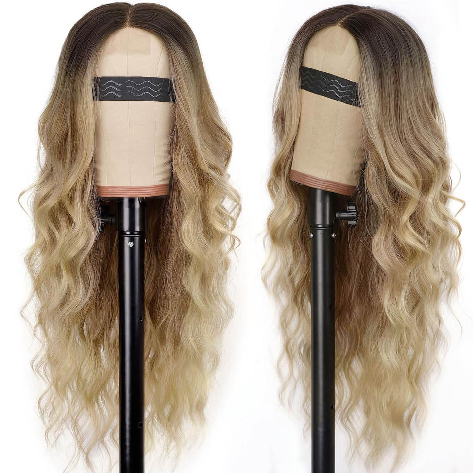 วิกผมลอนสังเคราะห์สำหรับผู้หญิงผมยาวลูกไม้ด้านหน้านุ่มสบายทนความร้อนในชีวิตประจำวันผมสีบลอนด์
