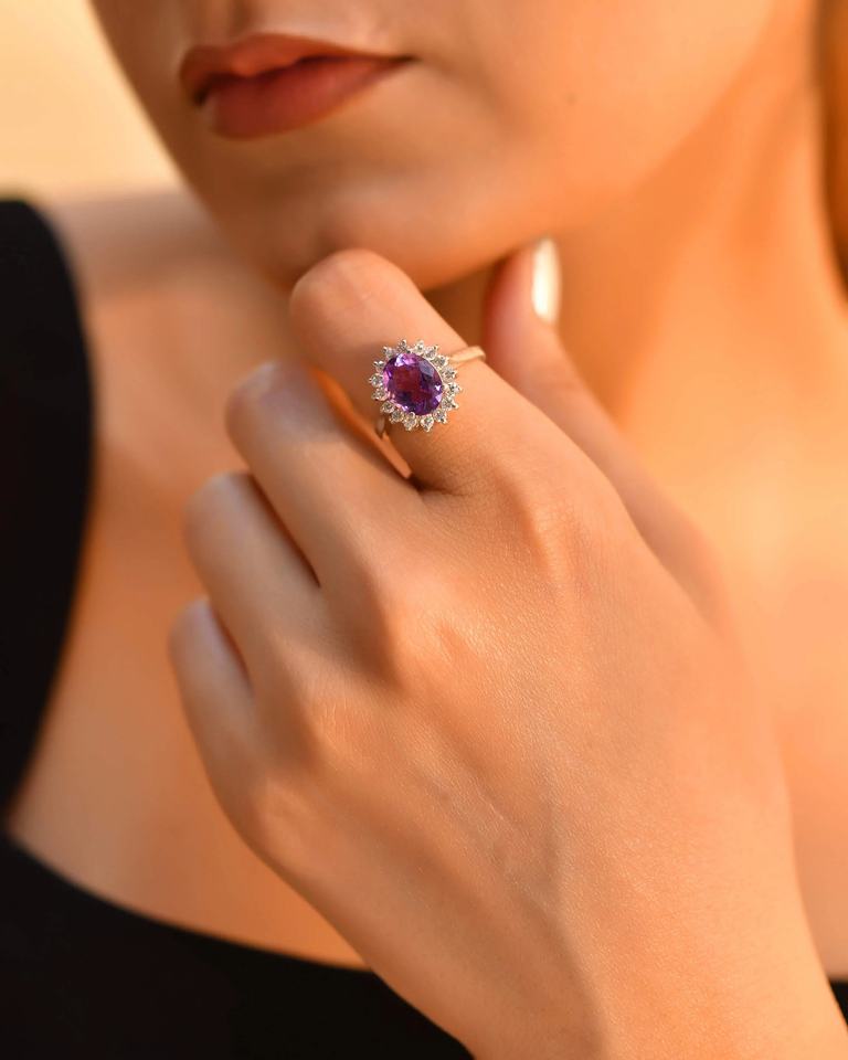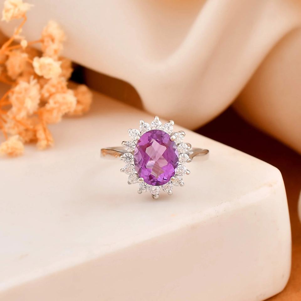 แหวนเงินอเมทิสบาบลูมมแหวนแฟชั่นที่สร้างขึ้นอย่างเชี่ยวชาญด้วยการเน้นพลอยสีม่วงสดใสสีม่วงเข้ม