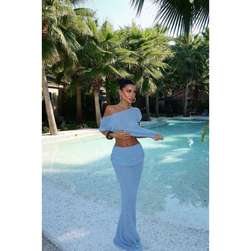 ชุดเซ็ต 2 ชิ้น สีฟ้า รุ่นใหม่ล่าสุด กางเกงขาสั้นเหนือเข่าพร้อมเสื้อสำหรับฤดูใบไม้ร่วง