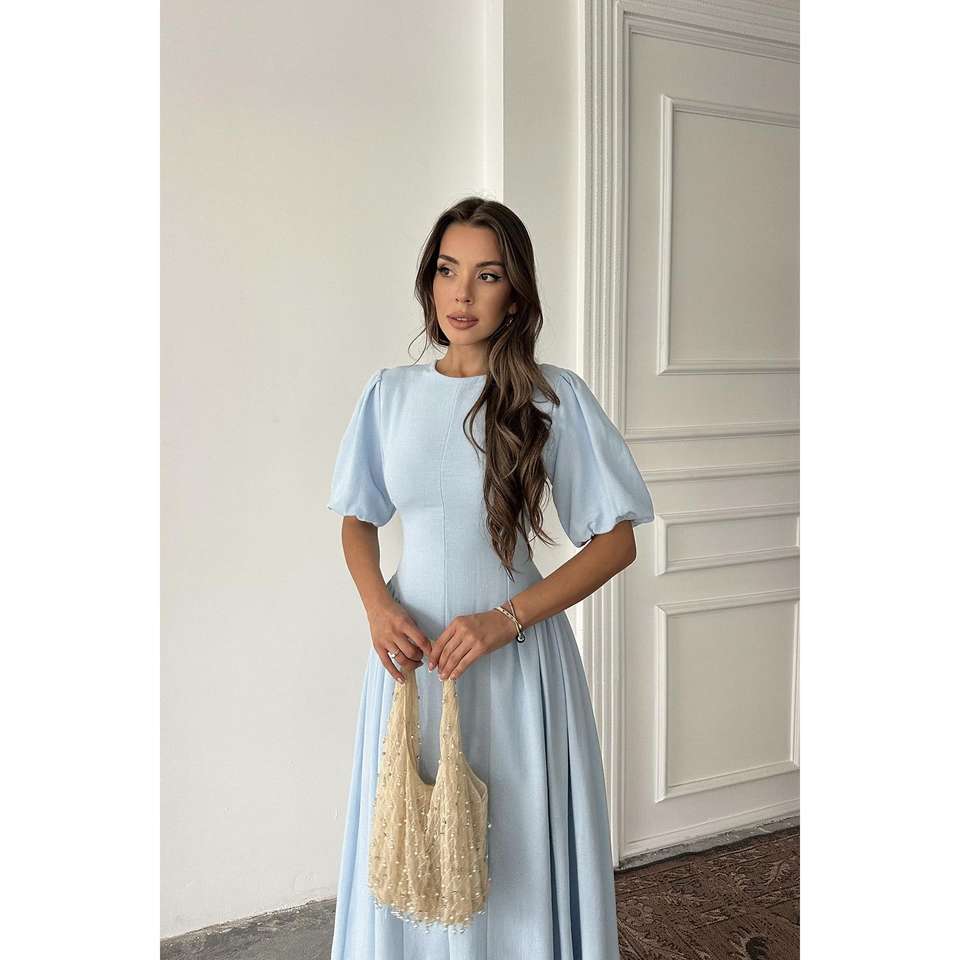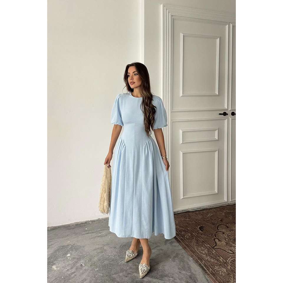 เดรสผ้าลินินสีน้ำเงินทรงเอ คอโอ ผูกหลัง เอวธรรมชาติ ใส่ได้ทุกวัน ระบายอากาศได้ดี ผ้าทอเนื้อนุ่ม สวมใส่สบาย