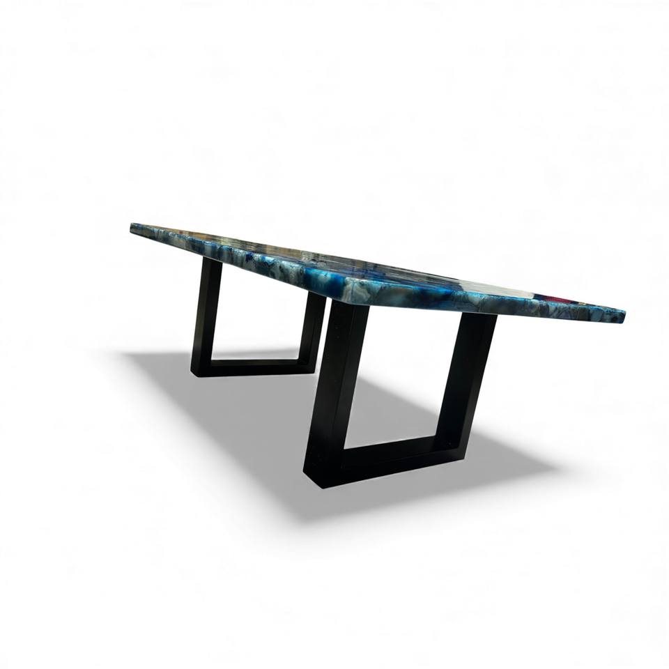 ท็อปเคาน์เตอร์ครัวรูปสี่เหลี่ยมผืนผ้าทำจากหินอาเกตสีน้ำเงิน งานแฮนด์เมดสั่งทำพิเศษสำหรับบาร์และบุฟเฟต์กาแฟ หินโปร่งแสง ตกแต่งร้านอาหารหรูหรา
