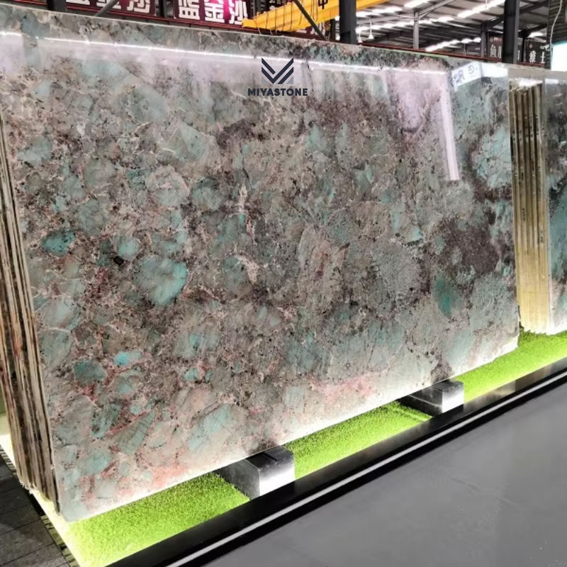 หินอ่อนธรรมชาติสีฟ้าอมเหลืองขัดเงาแบบโมเดิร์นแผ่นใหญ่กึ่งมีค่าโปร่งแสงสำหรับไฟแบ็คไลท์