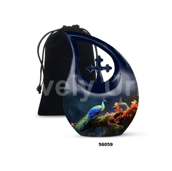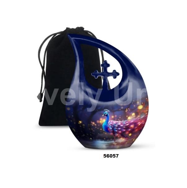 Blue Aluminium Tear Drop Peacock Cremation Adult Urn for Human Ashes Decorative Cross Funeral Urn With Free Velvet Bag