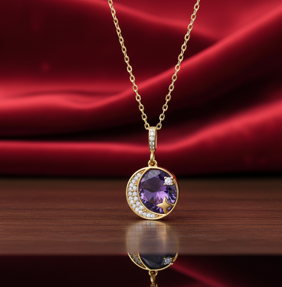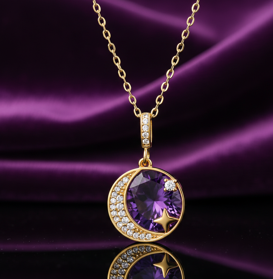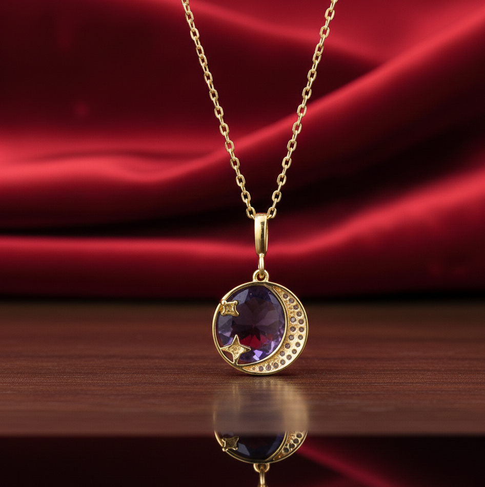 สร้อยคอพลอยแอมเมทิสต์สีน้ำเงินและเพชร CZ ขนาด 10 มม. เงินแท้ 925 ชุบทอง 18K น้ำหนัก 10 กรัม สร้อยคอจี้ทรงกลมขนาด 16 นิ้ว ของขวัญสำหรับเธอ