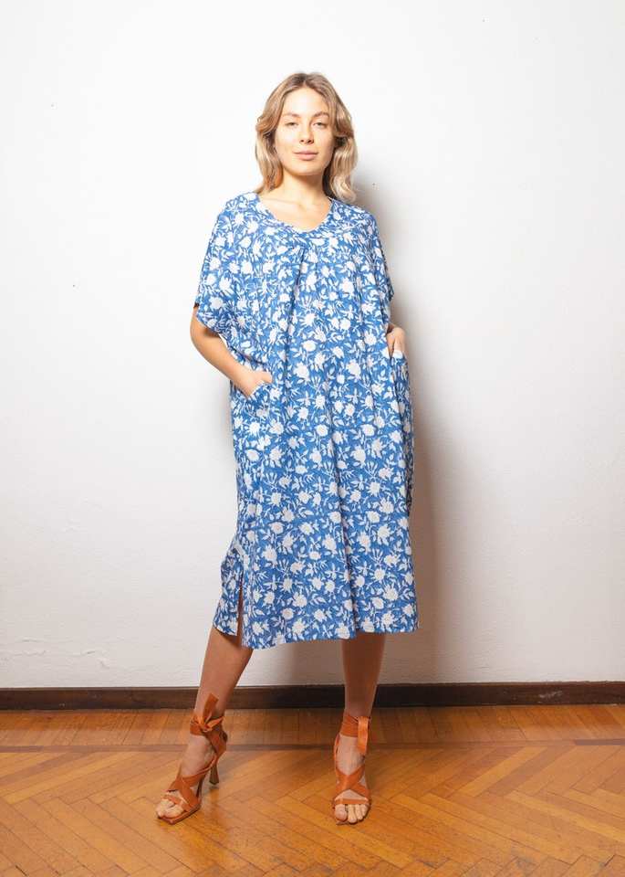 ชุดเดรสผ้าฝ้ายอินเดียพิมพ์ลายดอกไม้สีน้ำเงินและสีขาว น้ำหนักเบา เหมาะสำหรับใส่ในฤดูร้อน