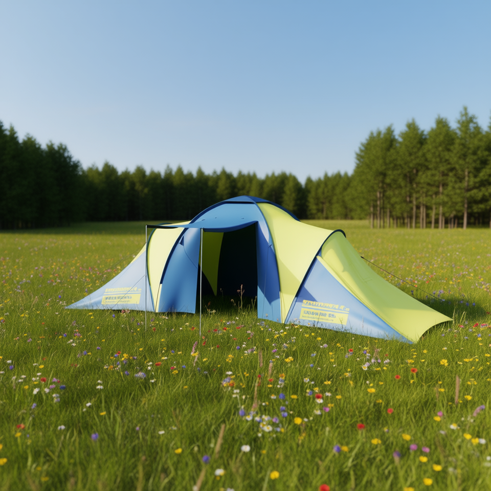 เต็นท์แคมป์ปิ้ง 6 คน สีน้ำเงินและสีเหลือง ผ้าอ๊อกซ์ฟอร์ดสองชั้น สำหรับสามฤดู หนึ่งห้องนอน