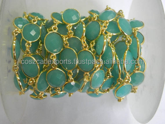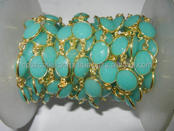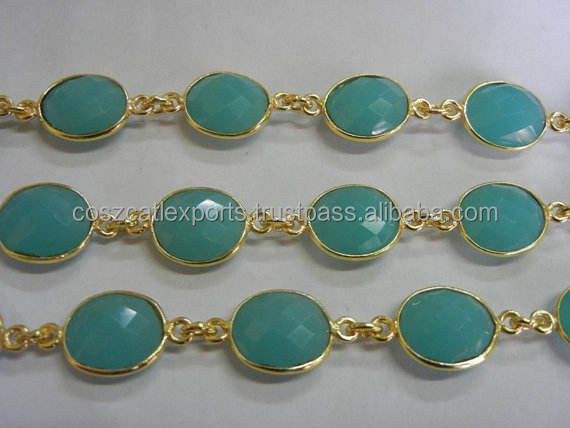 ห่วงโซ่เชื่อมต่อสีน้ำเงิน Chalcedony ชุบทอง24K,หัวต่อแบบต่อเนื่องพร้อมฝาลูกปัดสีฟ้า