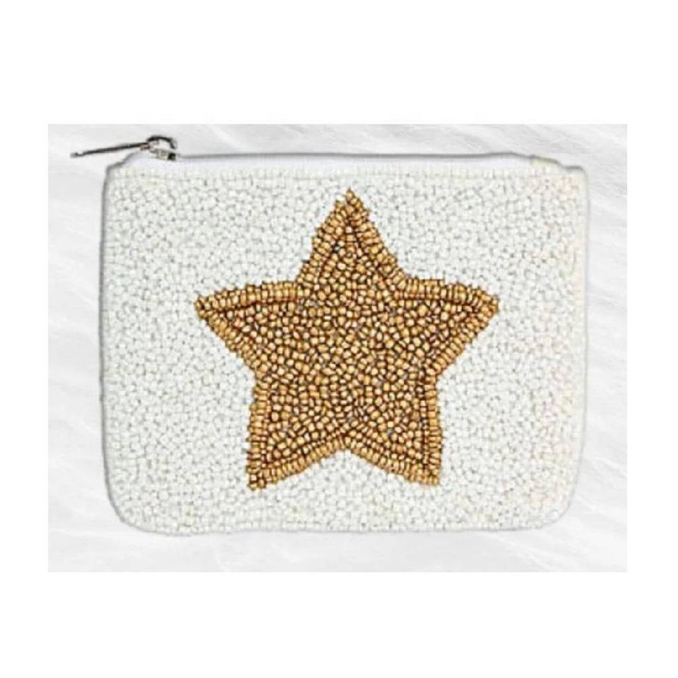 กระเป๋าใส่เหรียญขนาดเล็กประดับลูกปัดสีน้ำเงินพร้อมซิปดีไซน์รูปดาวสีขาว พกพาสะดวกสำหรับเก็บเหรียญและใส่บัตร อุปกรณ์เสริมสำหรับผู้หญิง