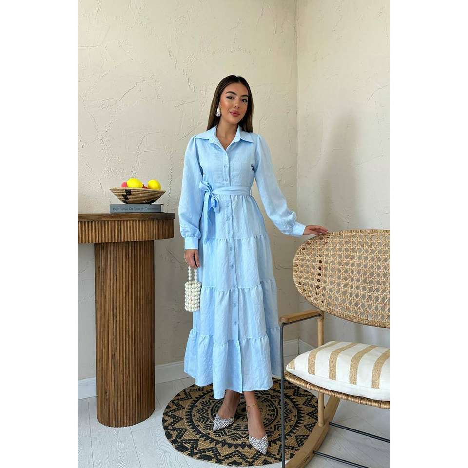 เดรสทรงเอไลน์สีน้ำเงิน คอปก เอวธรรมชาติ ผ้าทอ ระบายอากาศได้ดี เหมาะสำหรับใส่ในชีวิตประจำวัน