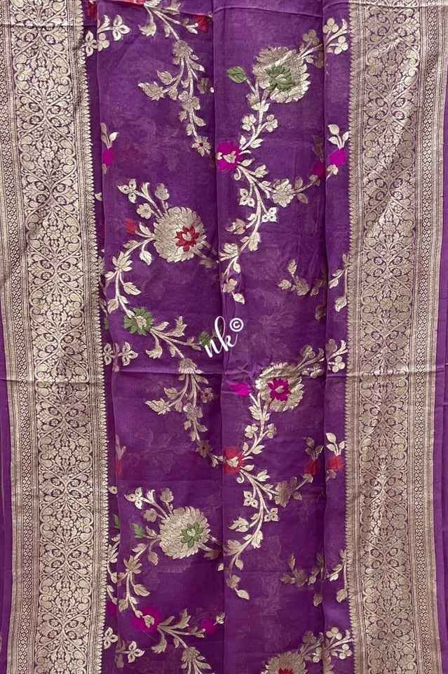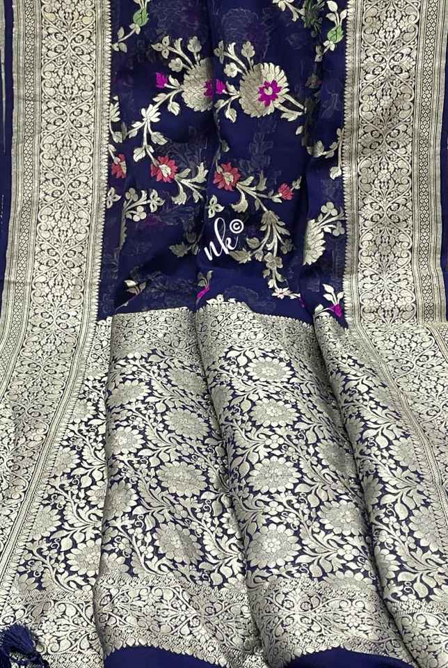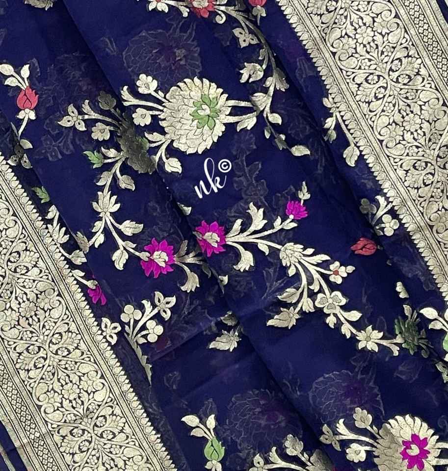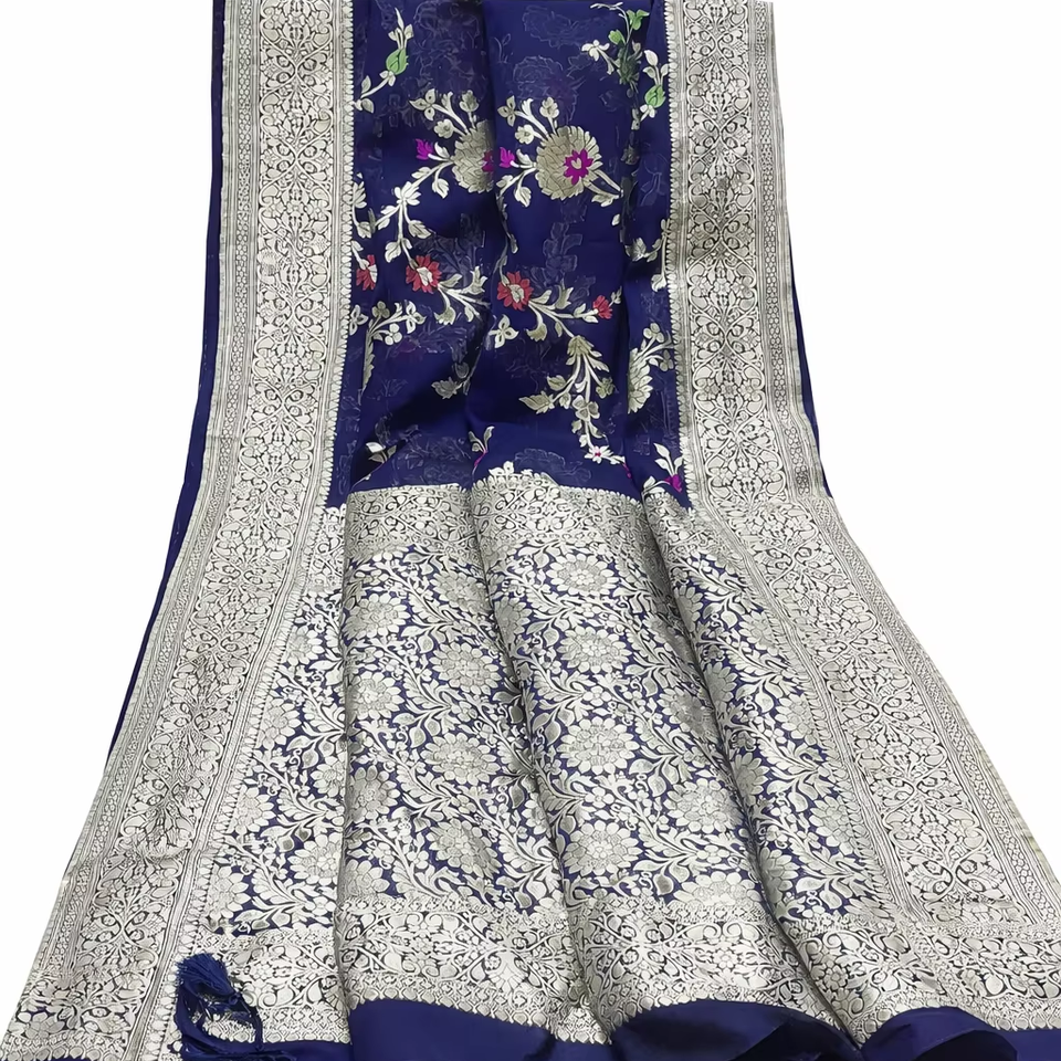 ส่าหรีผ้าไหมสีฟ้าผสมกับดอกไม้ซารีสีเงินสลับซับซ้อนและชายแดนแบบดั้งเดิมที่อุดมไปด้วยสำหรับงานปาร์ตี้ในโอกาสต่างๆ