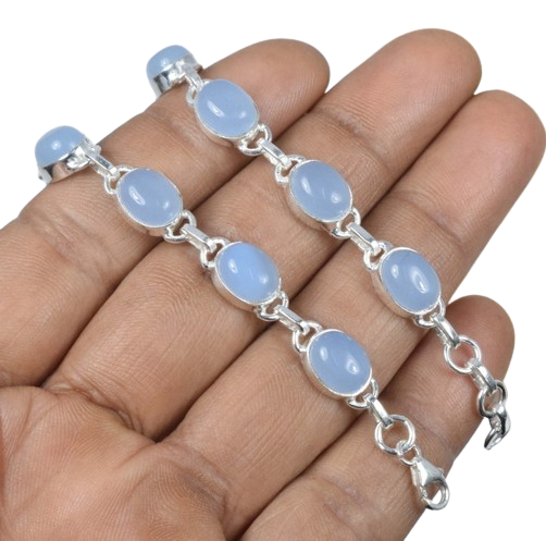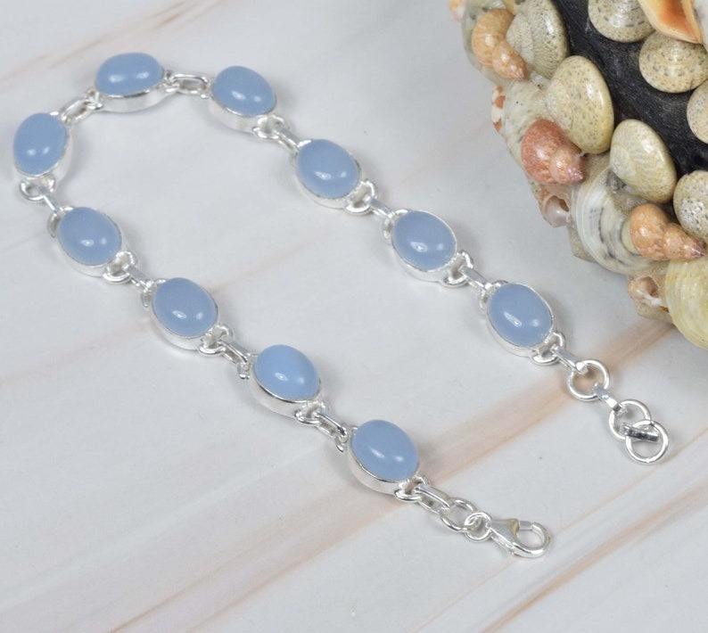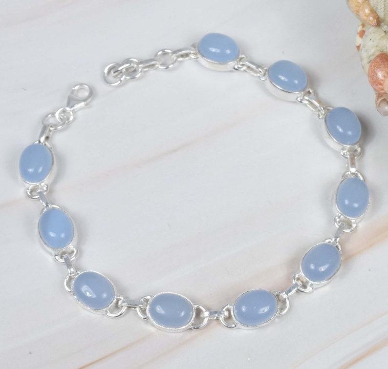 สีฟ้าชาลซิโดนี 925 เงินสเตอร์ลิงอัญมณีปรับ Handmade สร้อยข้อมือเครื่องประดับมีนาคม Birthstone ของขวัญวันเกิด 10 หิน
