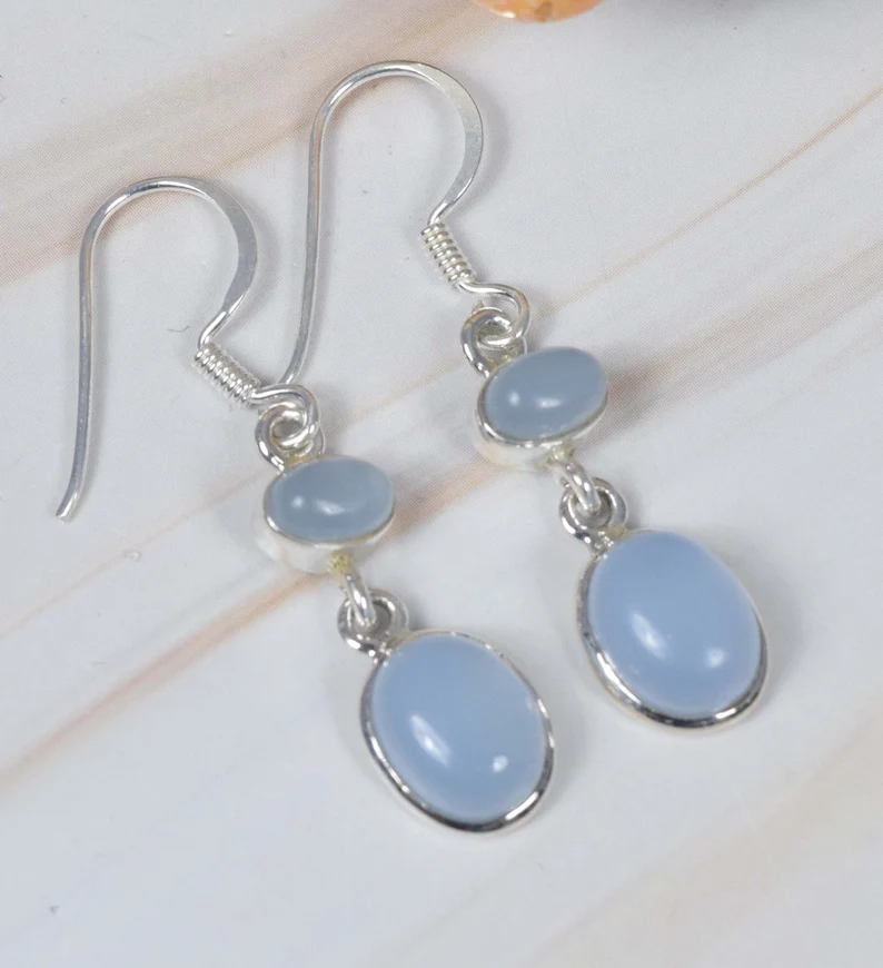 925พลอยคาลซิโดนีสีน้ำเงินทำด้วยมือต่างหูทำด้วยเงินสเตอร์ลิงเครื่องประดับอัญมณีสำหรับคริสต์มาส2หิน