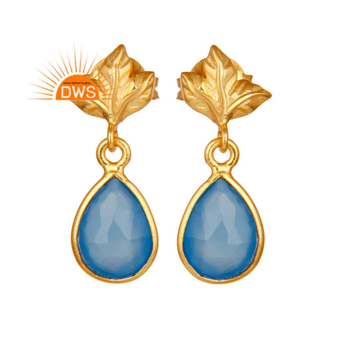 ต่างหูพลอยบลูคาลเซโดนี ดีไซน์ใบไม้ ชุบทองบนเงิน ต่างหูห้อย ผู้จำหน่ายเครื่องประดับ คอลเลคชั่นวินเทจ