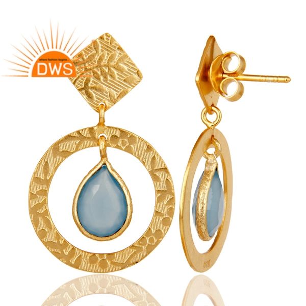 Blue Chalcedony Gemstone Earrings Indian Gold Plated Texture 925 Silver Designer Dangle Earrings Jewelry Wholesale