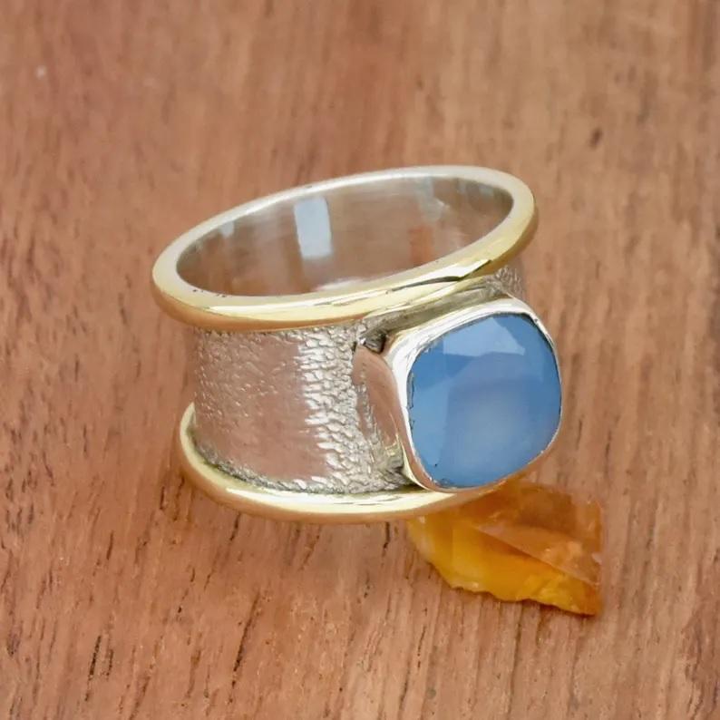 แหวนพลอยคาลซิโดนีสีน้ำเงินสำหรับผู้หญิง925สายคาดกว้างสีเงินสเตอร์ลิงทำจากวัสดุสองโทนสี