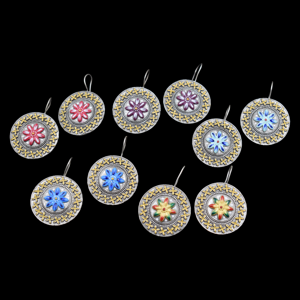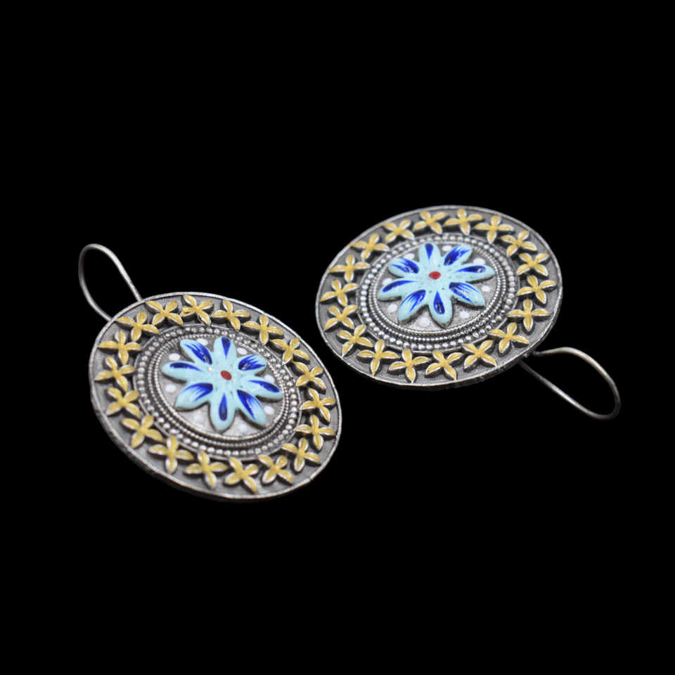 สีฟ้าทรงกลมห่วงต่างหูภาพวาดมือออกแบบ pottary ต่างหูทองเหลืองชุบทองเครื่องประดับห้อยสำหรับผู้หญิง