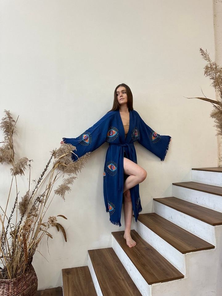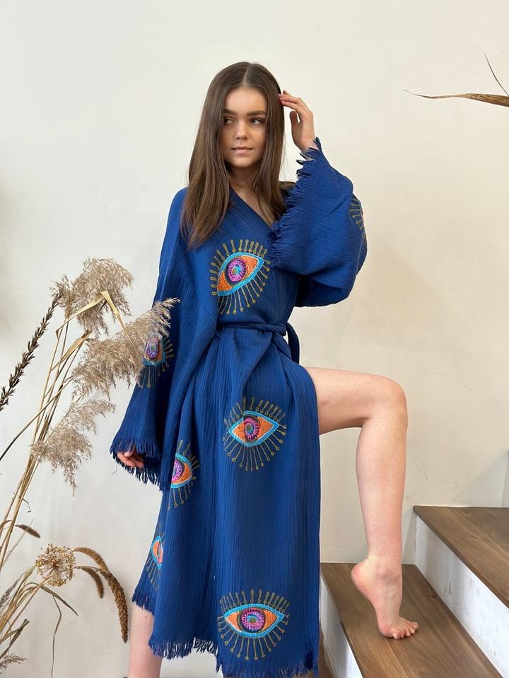 ชุดเดรสปักมือ Suzani สีฟ้า ชุดเดรสสไตล์สตรีและเด็กผู้หญิง