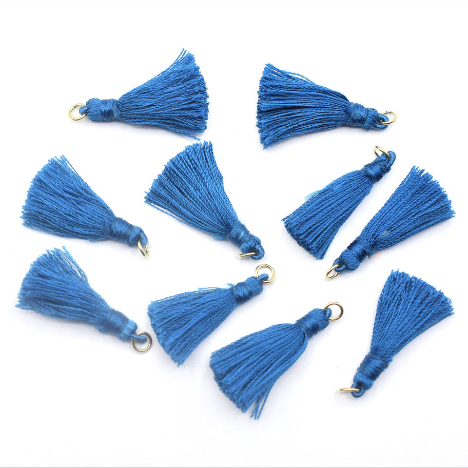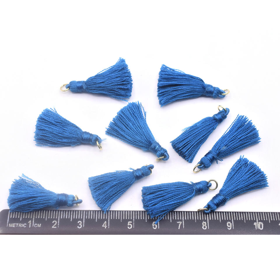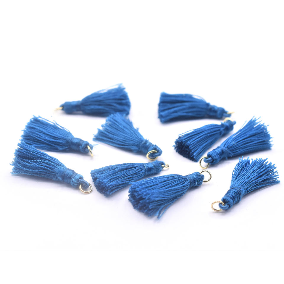 พู่สีน้ำเงินขนาด 30 ถึง 40 มม. พร้อมห่วงเกี่ยวชุบทอง ด้ายไหมไนลอน ขอบเงิน