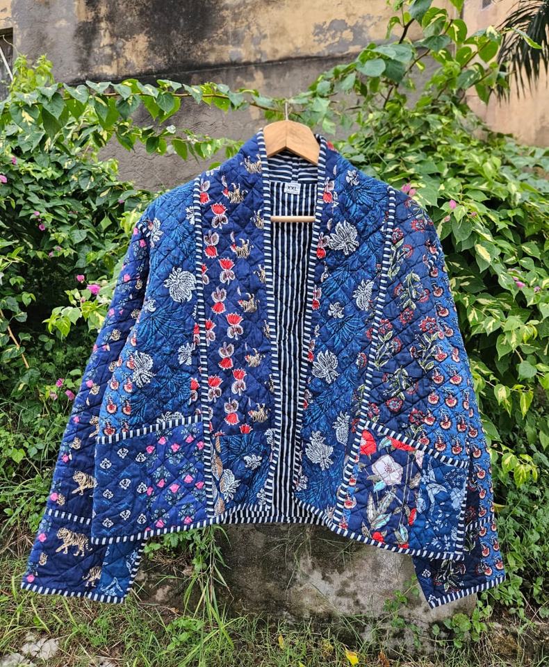 เสื้อโค้ทผ้าฝ้ายเย็บมือสีน้ำเงินสำหรับผู้หญิง ลายพิมพ์บล็อกอินเดีย สไตล์โบโฮ เหมาะสำหรับฤดูหนาว เป็นของขวัญสำหรับเธอ